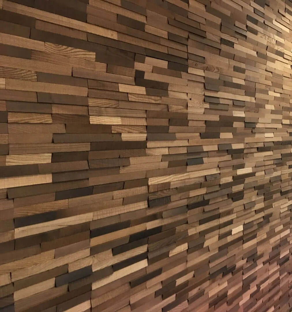 Conçu dans notre atelier, le parement 3D est produit à partir de frêne thermochauffé, offrant une teinte brun profond. La finition sciée en biais révèle le veinage et accentue le relief. Ce parement offre un rendu moderne et hautement décoratif.